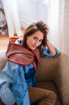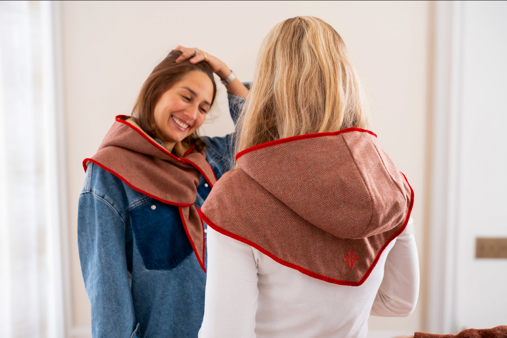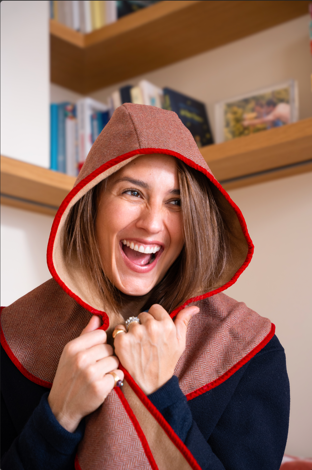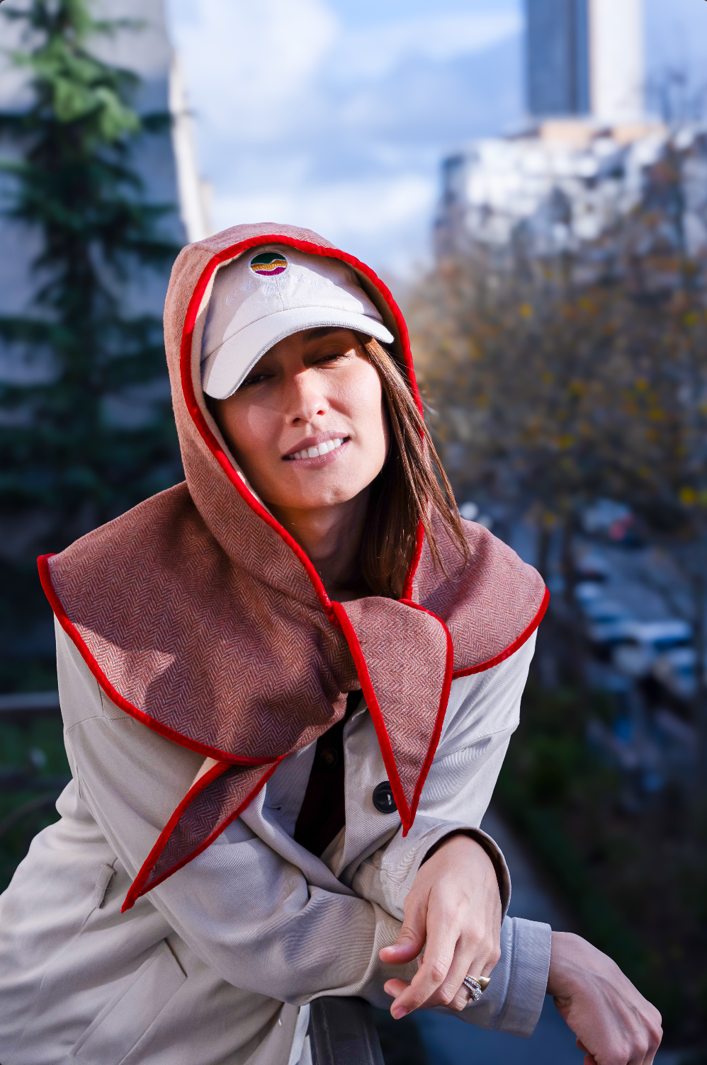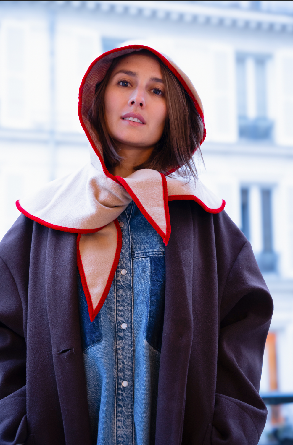 La Capuche est entièrement fabriquée main. Elle est en laine entouré de velours rouge et est réversible d'un coté en chevron et de l'autre en beige uni.