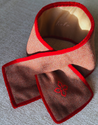 Le Cache-Cou est entièrement fabriqué à la main, il est en laine entourée de velours rouge avec un quadrifoil brodé à la main. Il est réversible d'un coté en chevron et de l'autre en beige uni.